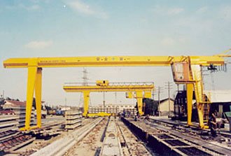 用於船台拚裝船體,常備(bèi)有兩台起重小車:一台有兩個主鉤,在橋架上翼緣的軌道上運行;另一台有一個主鉤和一個副鉤,在橋架下翼緣的軌道上運行,以便翻轉和吊裝大型(xíng)的船體分段(duàn)。起重量一般為100~1500噸;跨度(dù)達185米;起升速度為2~15米/分,還有0.1~0.5米/分的微動速度。