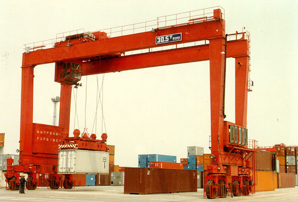 運到堆(duī)場或後方後,由集裝箱龍門起重(chóng)機堆碼起來或直接裝車運走,可加(jiā)快集裝箱運(yùn)載橋或其(qí)他(tā)起重機的周轉。可堆放(fàng)高3~4層、寬6排的集裝箱(xiāng)的堆場,一般用輪(lún)胎式,也有用有(yǒu)軌式的(de)。集裝箱龍門(mén)起重機與集裝箱跨車(chē)相比,它的跨度和門(mén)架兩側的高度都較大。為適應港口碼頭的運輸需要,這種起重機的工作級別(bié)較高。起升速度為8~10米/分(fèn);跨度根據需要跨越的集裝箱排(pái)數來決定(dìng),*大(dà)為60米左右相應(yīng)於(yú)20英尺、30英尺(chǐ)、40英尺長集裝箱(xiāng)的(de)起重量分別約為20噸、25噸和30噸。